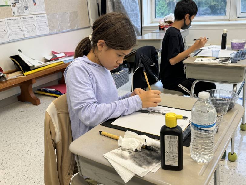 5年生は、9月26日(木)に墨絵教室を開催しました。墨絵教室に参加した5年生8名にとっては、毎週書写の授業は行っていますが、墨と筆を使って絵を描くという活動はほとんどの児童が初めての体験でした。事前にテキストを配って予習しましたが、子供たちからは期待と同時に不安の声が挙がっていました。