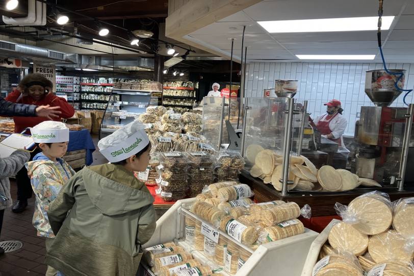当日は、児童はいただいたStew Leonald’sの帽子をかぶり、心の準備を万端に整え、担当者の方から売り場や商品の説明を受けながら店内を案内してもらいました。「できる限り新鮮なものを提供するために工夫しています」と生きているロブスターを見せてもらったり、「お客さんの要望に応じて無料で肉をカットしています」と教えていただき、児童からは驚きの声が上がりました。また、ポップコーンをその場で作って提供するなど様々な商品が手作りされている様子を見たり、店内の至るところにある子供のお客様を喜ばせる工夫を探したりと、目で見たことや感じたことを学習のしおり一杯に記録する様子が見られました。