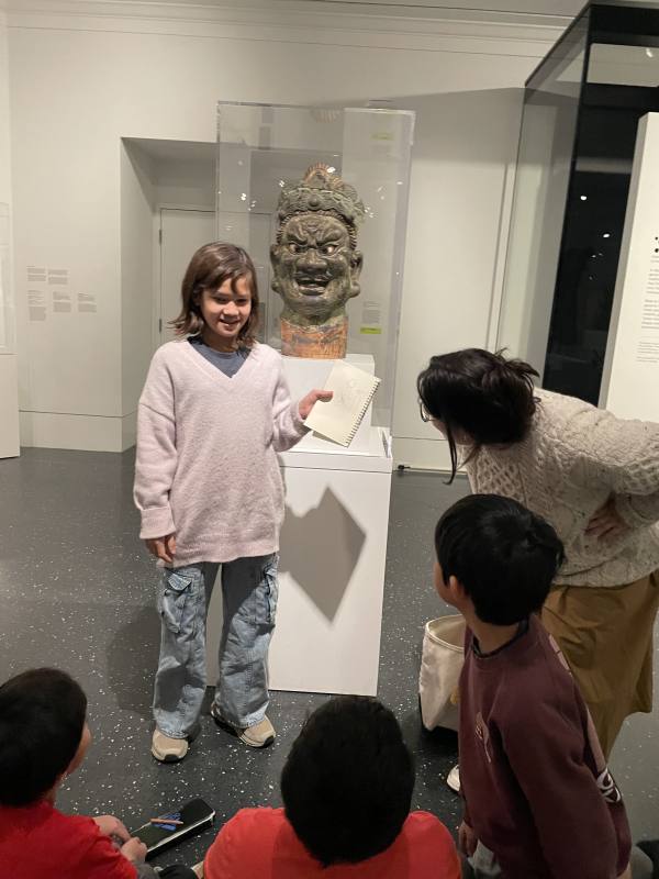 美術館では、学芸員さんに案内してもらいながらから館内をまわり、日本の仏像、アメリカの現代アートやエジプトの彫塑物などを見て、何が見えるか、何を表しているかなどを考え、感じ、話し合いながら本物のアート作品に触れました。