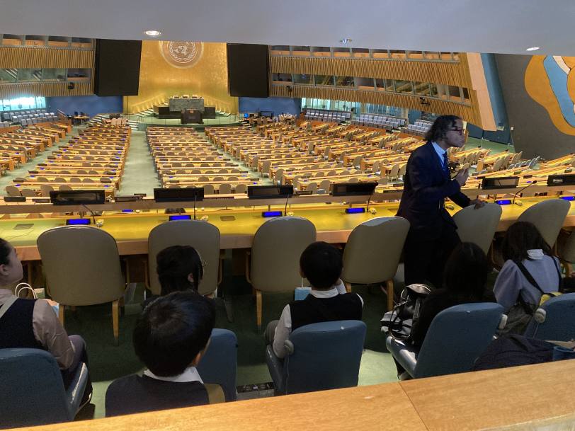 国際連合本部の訪問では、ガイドさんからの英語での説明を受けながら館内を見学し、最後に各国の代表の方が集まって話し合う広い総合ホールを見て、「すごいなあ」と感激しつつ、グローバルな世界に浸ることができました。