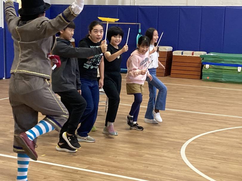 子供たちは、実際にフィジカルコメディーを見て、身体を使った表現に挑戦しました。「どんな表現も正しいんだよ」と言われ、それぞれが思い思いのフィジカルパフォーマンスを行いました。
