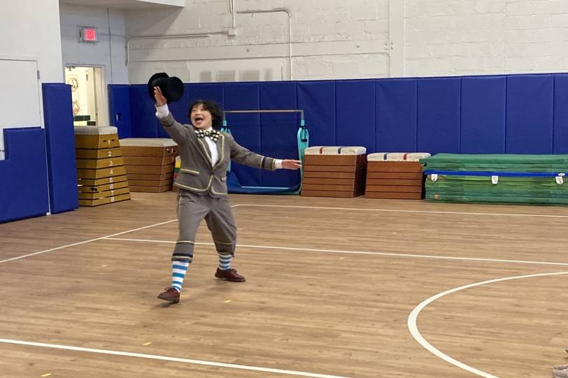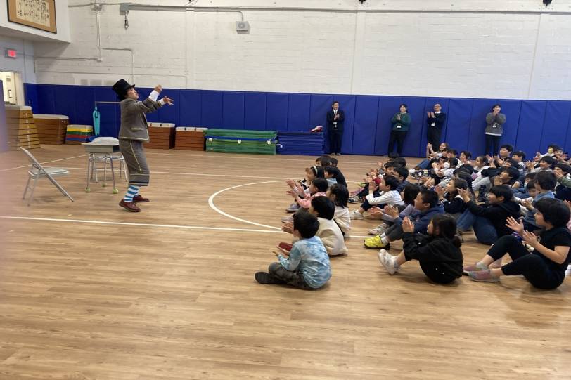 パフォーマンスの終わりに岩佐さんはワークショップを開き「パフォーマンスでの表現はすべて正しいから自信をもって表現しよう」と、全校児童生徒にクラウンの考え方を伝授し実演をしました。子供たちは岩佐さんの指導を真剣に聞き、想像上のボールを大きくしたり、投げたり、食べたりして、体だけで表現することの楽しさを味わっていました。