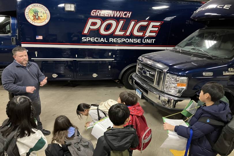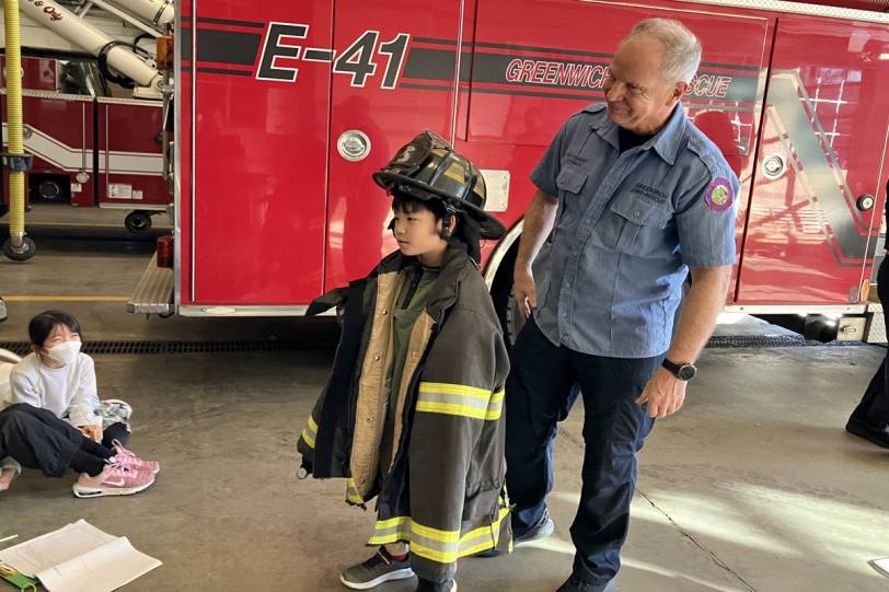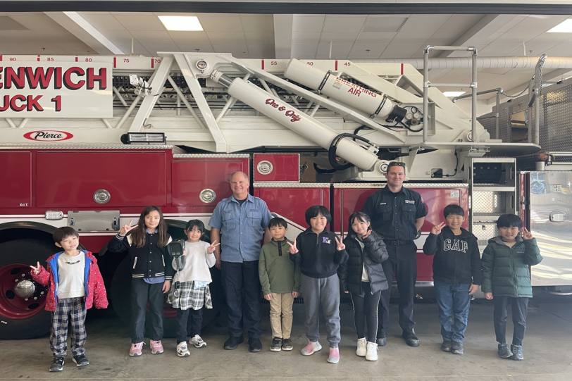 初等部3年生が、12月4日(水)にグリニッチの消防署と警察署を訪れました。消防署では、消防隊員の方から火事が起きた際の対応や消防の仕事について話を聞きました。隊員の方々の防火への取組の苦労と責任感の強さの説明を受けているとき、途中で警報が鳴り実際に出動する場面があり、迅速に防護服に着替える様子など目の当たりにしました。