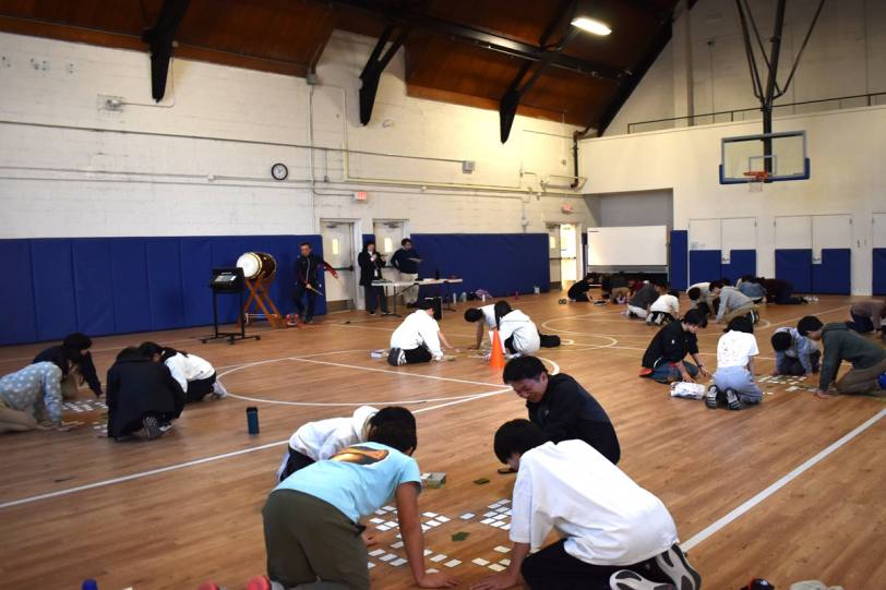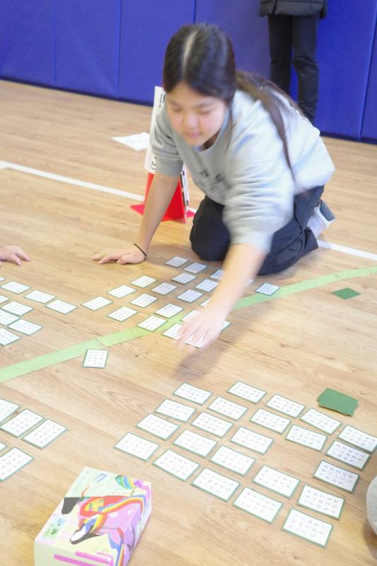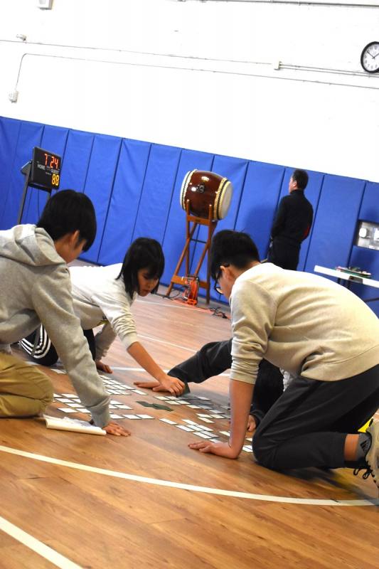 大会本番は「横綱」「大関」「関脇」「小結」の学年混合9グループに分かれ練習の成果を競い合いました。「ちはやふる神代もきかず竜田川…」の一文字目が読まれるや否や、その札に一斉にとびかかる場面もあり、大いに盛り上がりを見せました。また、英語科のアメリカ人教師も読み手として参加し、日本の伝統文化の良さ、日本語の響きの美しさを、児童生徒とともに共有しました。