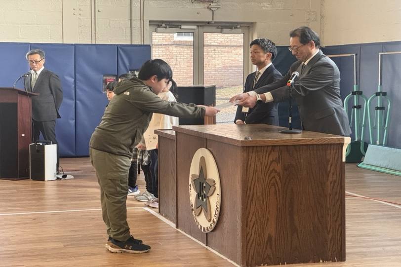 校長より児童生徒代表へ修了証書が手渡され、児童生徒は、堂々とした素晴らしい姿で受け取り、この1年が充実した生活だったことを物語っていました。その後校長は、3学期の学習や行事、活動を振り返り、1年間の子供たちの成長を称えました。また自分を信じて「自分はできる、やれる」という気持ちをもって、これからも歩んでいってほしいとエールを送りました。