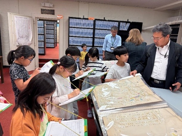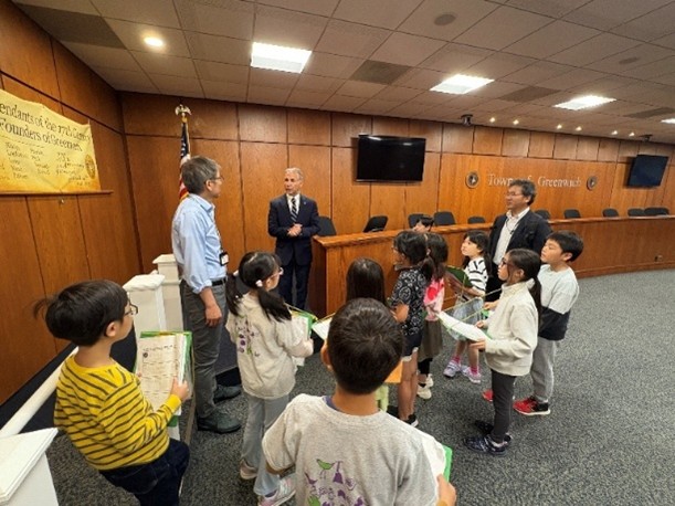 その後、Greenwich Town Hallへ行き、施設内を見学しました。地下の部屋では、歴史的な書類やGreenwichの昔の地図など、実物を見たり触ったりしながら学びを深めていきました。First SelectmanであるFred Camillo氏からも街の歴史や市役所の仕事について話を聞き、子供たちは「なぜFirst Selectmanになろうと思ったのですか」「なぜGreenwichはアメリカ合衆国の中でも住みやすい街と言われているのですか」など、英語を使って質問をしました。