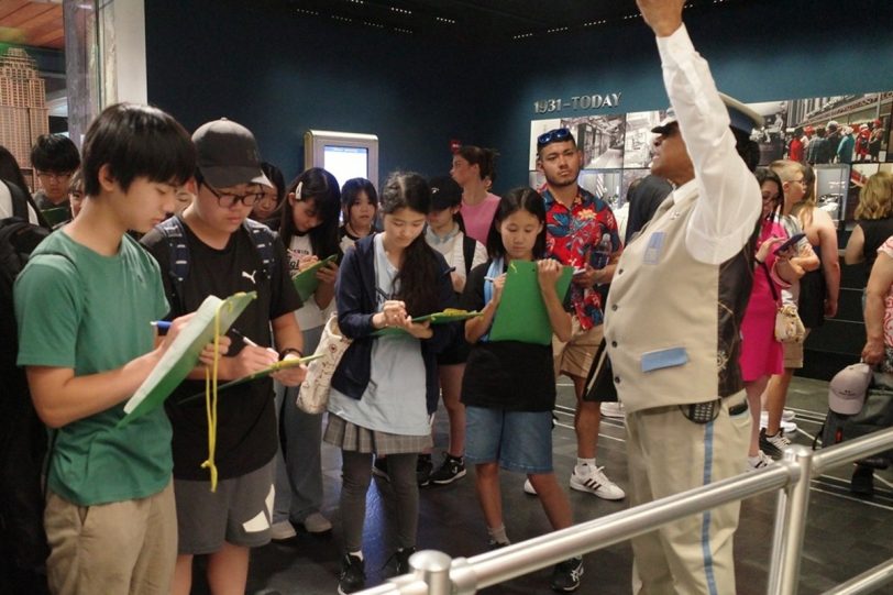 中等部の生徒は,その環境対策を未来の街づくりに生かすことができるのではないかと,事前学習を経て,エンパイアステートビルのツアーに参加しました。生徒たちはツアーガイドの話に耳を傾け,懸命にメモをとりながら事前学習で得た知識と新たな情報を整理していました。
