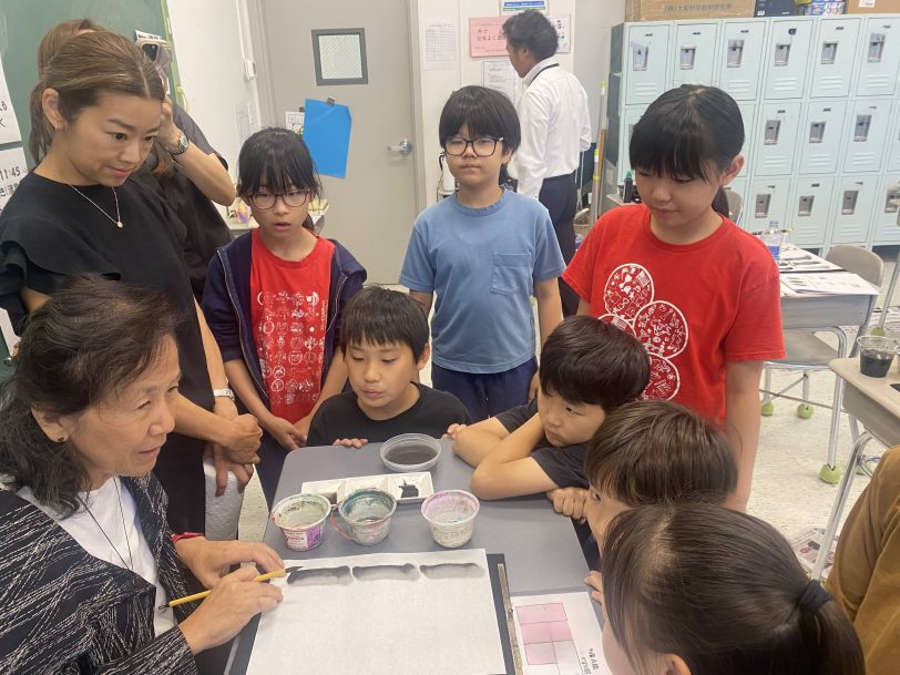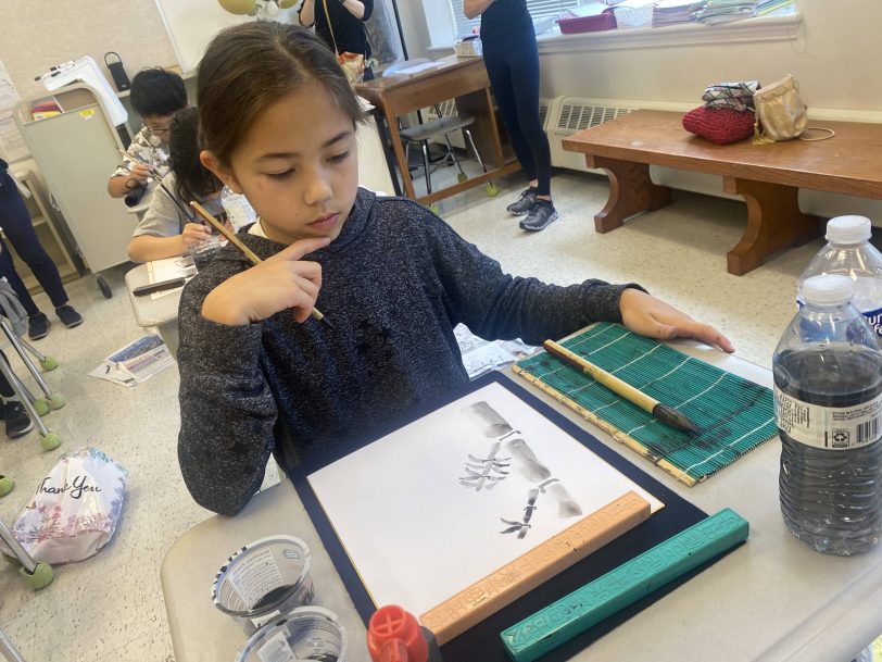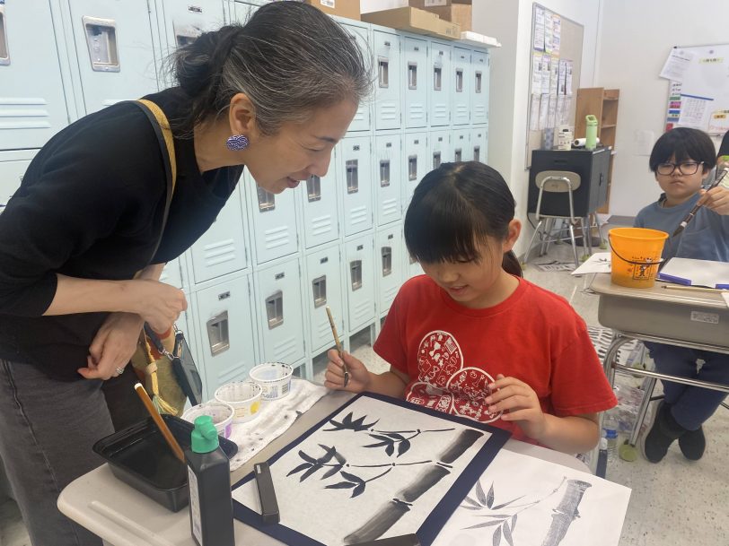 9月26日(金)に墨絵教室を開催しました。墨絵教室に参加した5年生17名にとっては、毎週書写の授業は行っています。墨と筆を使って絵を描くという活動はほとんどの児童が初めての体験でした。 当日、講師のJackie Alexander先生から墨絵の歴史についてお話を聞きました。その後、3つの濃淡の墨汁づくりや筆の使い方、墨の濃淡の出し方、筆の運び方を習った後は、いよいよ竹を描く活動へと移りました。最初は、墨がにじんだり、全く濃淡が出なかったりと苦労していましたが、練習を繰り返し、次第に筆の運び方のこつをつかみ、濃淡を付けることができるようになっていきました。先生方に「濃淡の付け方が上手になったね」などの言葉を掛けられ、児童たちは、満面の笑顔で制作していました。活動の集大成として色紙に墨の濃淡が織りなす美しさを感じながら「竹」の絵を描きました。出来上がった作品に満足し「楽しかった。また、体験したい」と感想を述べていました。アメリカにいながら、伝統芸術に触れることができた児童にとってはかけがえのない体験となりました。