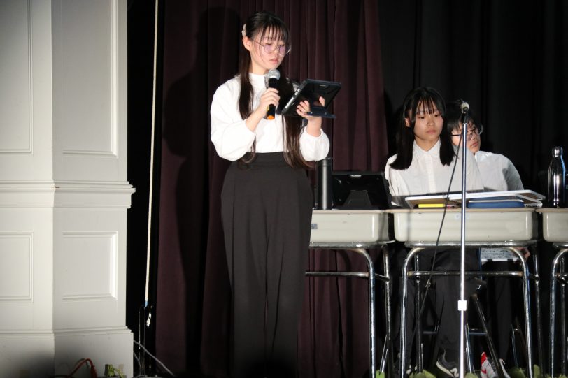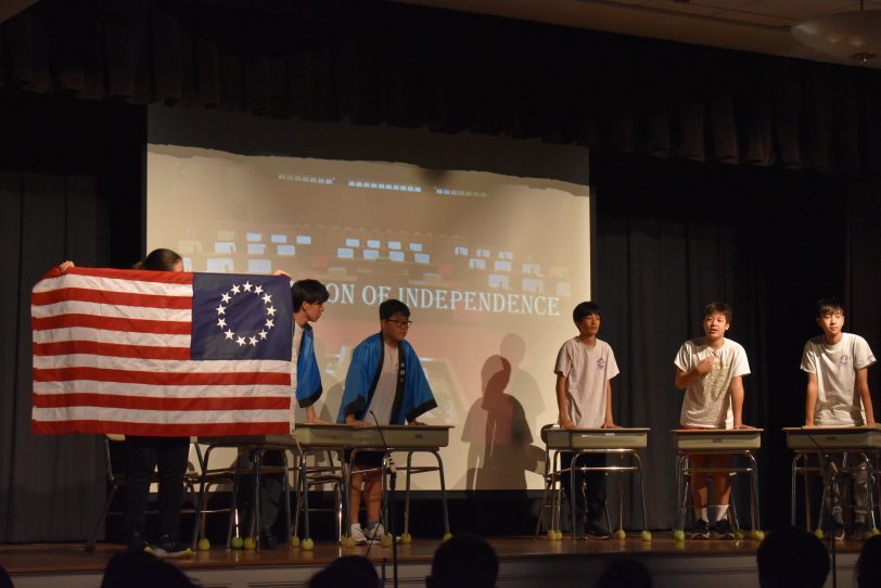 7・8年生は、修学旅行で学んだアメリカ独立の歴史をもとに、「アメリカの独立~自由のために立ち上がれ~(The Rise of America)」を上演しました。台本づくりや演出、小道具の準備などを自分たちで行い、迫力ある演技で観客を魅了していました。9年生はディベート「教科書はすべてデジタル化すべきか」をテーマに、肯定側と否定側に分かれて熱い議論を展開しました。論理的思考力と表現力が試される真剣な発表となりました。