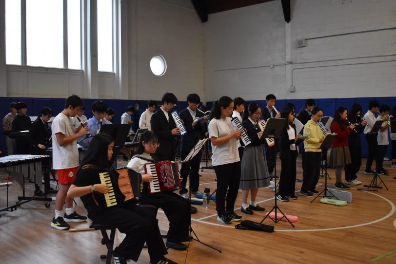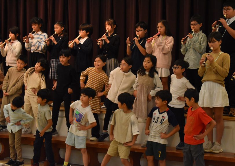 音楽発表では、初等部が合唱「ともだち讃歌」を披露しました。上級生がリコーダーを奏で、下級生がダンスで参加する姿に、学年を越えた温かい雰囲気が感じられました。中等部は合唱「空は今」と合奏「Sing Sing Sing」を披露し、平和と希望を込めた歌声と迫力あるジャズのリズムで、フィナーレを華やかに飾りました。