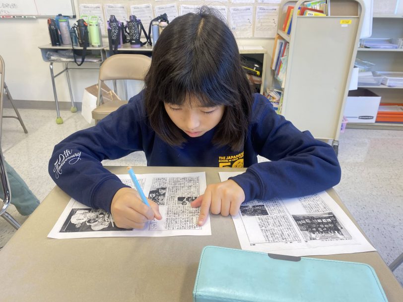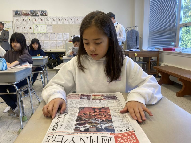 5年生が10月17日、国語科の授業で「週刊NY生活」の発行人・三浦良一氏を招き「新聞を読もう」の学習の一環として、新聞の役割や編集の仕事について学びました。