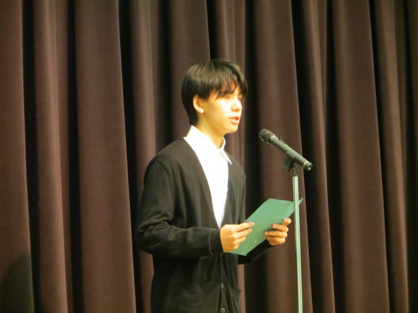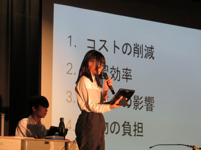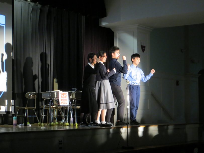 9年生はディベート団体戦の決勝戦を行いました。「教科書はすべてデジタル教科書にするべきだ」という論題のもと,これまでトーナメント戦を行ってきたのですが,その決勝チーム同士の対戦です。それぞれの立論ではプレゼンテーションソフトを効果的に使って,自分たちの訴えたいことを分かりやすく伝えていました。反ばくの段階では,互いに弱点を探りながら自らの論が有利になるようにしのぎを削り合っていました。会場の皆さんにも採点していただきながら,熱い論戦を観ていただきました。ディベートそれ自体もさることながら,裏方としてのアナウンスやルール説明,照明などの会場運営など,すべて自分たちの力でやりきったところに9年生の完成度の高さを感じました。