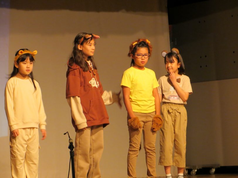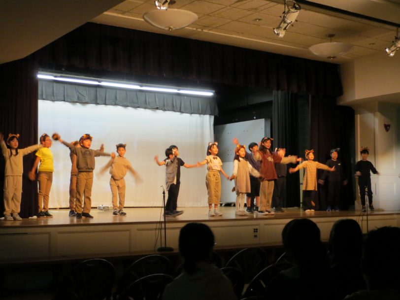 3年生と4年生は「ライオンキング」をミュージカル風に仕立てて演じていました。ニューヨークのブロードウェーでもロングランになっている注目の演劇を,子供達が工夫して演じています。動物の動きやヌーの大群,「ハクナマタタ」の歌と陽気な仲間たち。場面が切り替わるごとに真剣味が表現されたり,楽しい雰囲気が醸し出されたりして,会場の皆さんも物語に引き込まれていきました。最後の合唱では,3年生と4年生のみんなの元気な声が響き渡ってフィナーレ。演出の工夫と子供たちの表現の楽しさがいっぱいあふれる劇になりました。