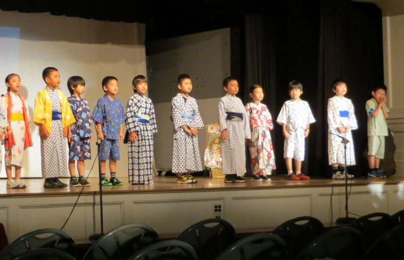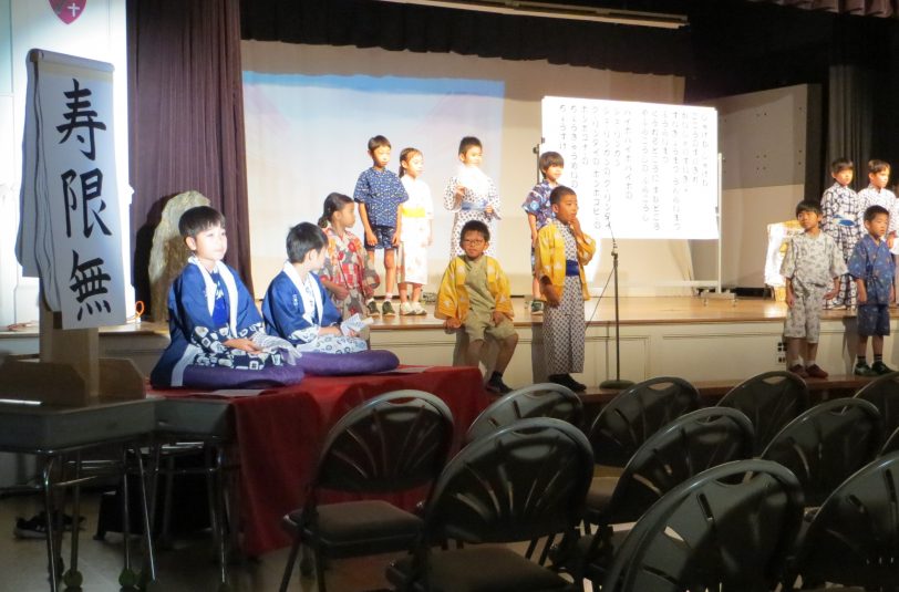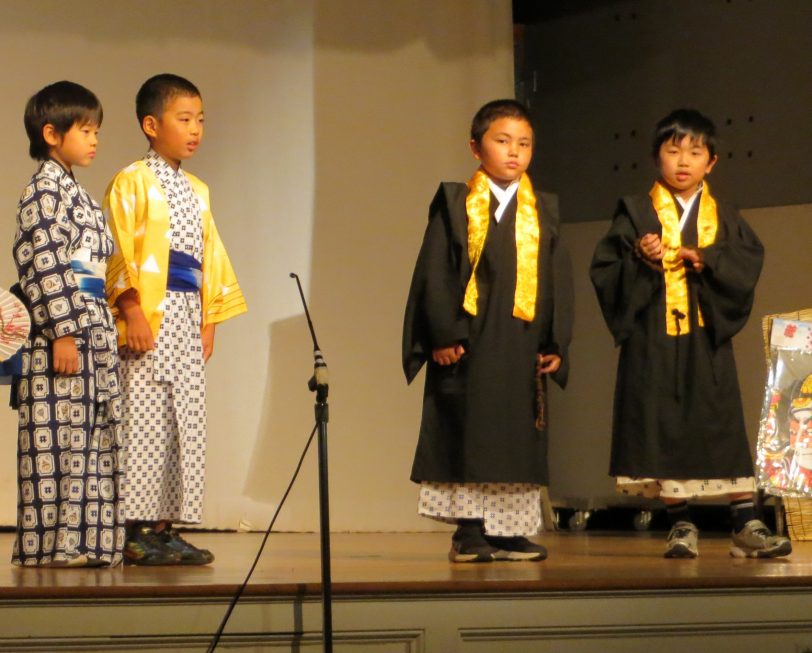 1年生と2年生は「寿限無(じゅげむ)」という落語の演目を劇で発表しました。浴衣を着て江戸時代の人に扮したリ和尚さんになったりして,日本の着物を着る体験になっていました。また,「かごめかごめ」のような昔ながらの遊びも劇の一場面として取り入れて日本文化を知るきっかけづくりとなっていました。子供たちは大きな声と大きく動かす手足で元気よく,わかりやすく演じていました。「じゅげむ じゅげむ ごこうのすりきれ…」という長い名前を一人一人が完全に覚えてしまって一生懸命に唱えているのを見ると大変微笑ましく思えました。会場の皆さんも巻き込んで「じゅげむ じゅげむ ごこうのすりきれ…」の大唱和。会場は笑いに包まれました。