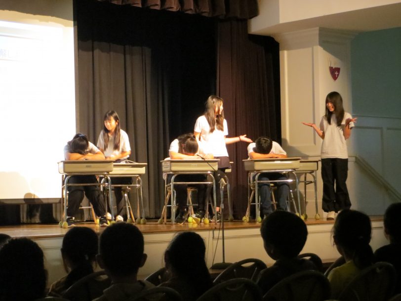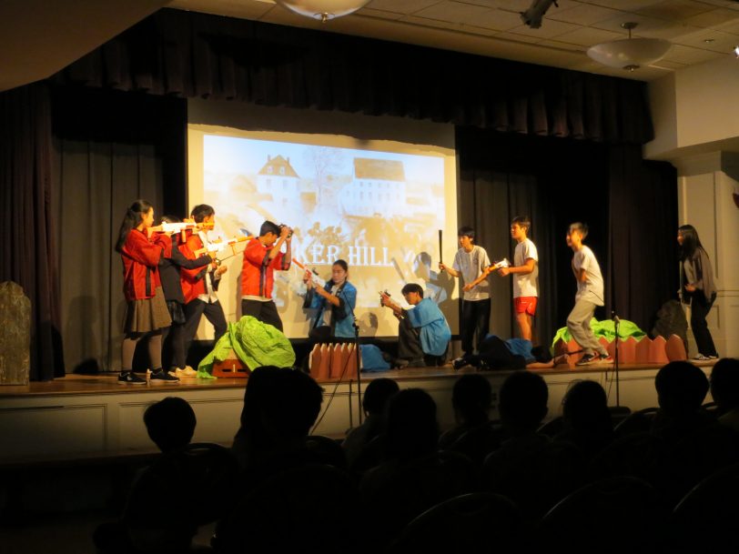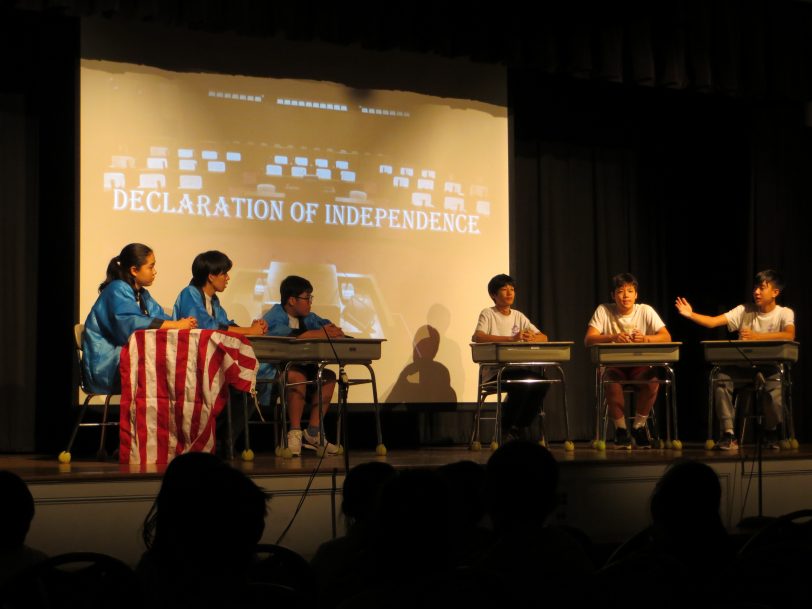 7年生と8年生は「アメリカの独立」を劇にして発表しました。8月下旬にワシントン,フィラデルフィア方面に修学旅行へ行き,そこで体験したことや感じたことをたくさん盛り込んだ劇に仕上がっていました。物語はある学校の社会の時間から始まり,タイムスリップ。そこで様々な時代の出来事を経験して帰ってくるというものです。まるで修学旅行の子供たちをほうふつとさせる設定となりました。「戦いに負けても自由は死なない!」というような独立を求めた人々の思いに寄り添って考えてみた印象的なセリフが散りばめられており,観る人を引き付けていました。
