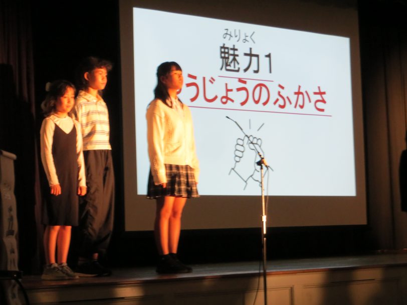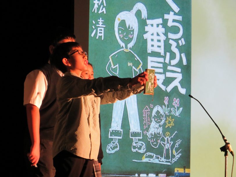 5年生と6年生は「ビブリオバトル」で,夏休みに読書感想文で選んだ図書についてチームでプレゼンテーションを行い,その魅力を余すところなく伝えました。4チームの発表からは,魅力を箇条書きにして挙げる,魅力を一言で表現する,その本を進めたい人のタイプを言う,などさまざまな工夫がありました。またゆっくり,わかりやすい言葉を選びながら話すという技術も高まっていることが分かりました。どの本も読んでみたいと思わせるプレゼンテーションでしたが,会場の皆さんには投票していただいてバトルの結果が楽しみになりました。5年生のパワフルさ,6年生のインテリジェンスが光る発表となりました。