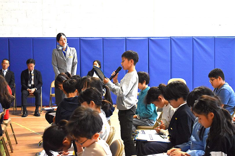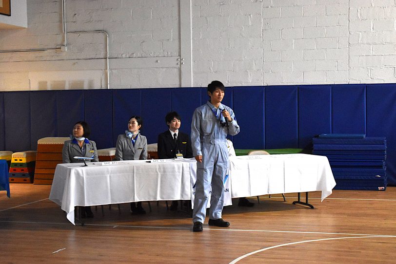 その後パイロットがフライト前にどのような確認をしているか、整備士が安全運航を支えるためにどんな工夫をしているか、客室乗務員が乗客に安心と快適を届けるためにどのようなことを心掛けているか、普段は聞くことのできない話が次々と紹介されました。子供たちは大きなスクリーンに映し出される飛行機の映像や写真を見ながら、真剣な表情で耳を傾けていました。また、途中にはクイズやアクティビティも取り入れられ「飛行機の重さは象が何頭分か」「フライト中に雷雲があったらパイロットはどうするか」といった問題に、子供たちは積極的に手を挙げて答えていました。驚きの答えに子供たちからは感嘆の声が聞こえました。