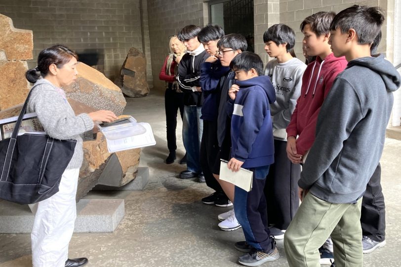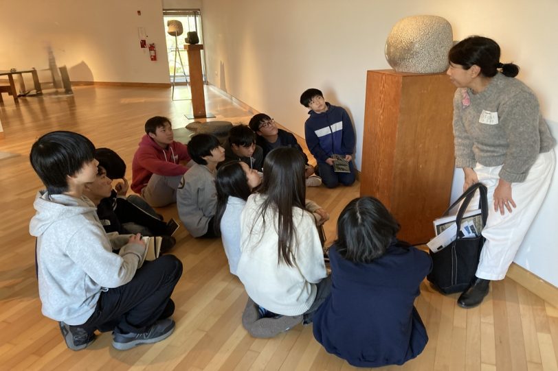 美術館に到着すると、学芸員の方からノグチ・イサムさんのルーツや作品への想いについての貴重な講義が行われました。生徒たちは、主に3つの作品を観賞し、作品に対する感想や、題名を付けるとしたらどんな題名にするかを考えました。様々な意見が飛び交い、対話が活発に行われました。